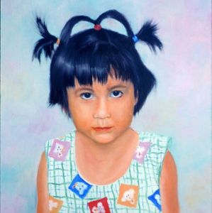 This portrait of a sweet young lady from Uzbekistan. Her hair style was so cute and in combination with her impish smile and charm, I had to commit her to canvas. She is quite a gifted dancer, even at the tender age of 6.